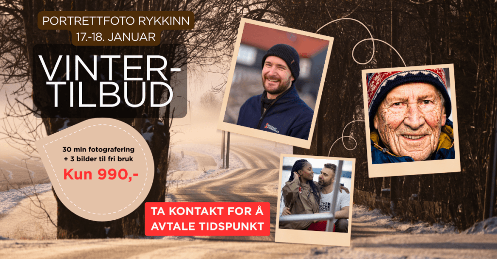 Helgen 17. – 18. januar 2026 tar jeg portrettbilder utendørs i det fine vinterværet på Rykkinn. Det er flere fine steder å velge i på og rundt Brennejordet og ved Wøyen gård og demningen.